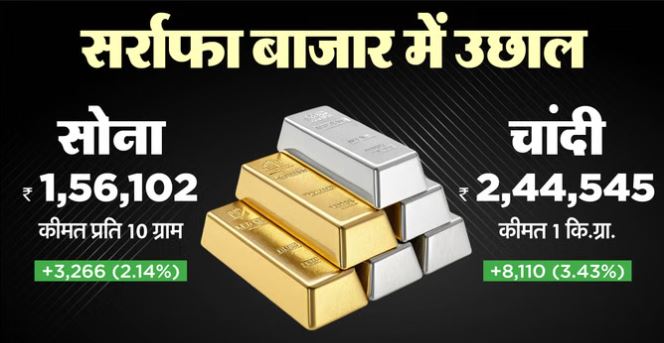 राजधानी दिल्ली में 24 कैरेट सोने का भाव बढ़कर लगभग 1,57,900 रुपये प्रति 10 ग्राम हो गया, वहीं मुंबई में यह करीब 1,57,750 रुपये प्रति 10 ग्राम पर पहुंच गया। इससे पहले एक दिन पहले दिल्ली के सर्राफा बाजार में सोने की कीमत करीब 2,400 रुपये (लगभग 1.5%) गिरकर 1,58,500 रुपये प्रति 10 ग्राम रह गई थी। वहीं चांदी की कीमत 13,500 रुपये टूटकर 2.55 लाख रुपये प्रति किलोग्राम आ गई थी।