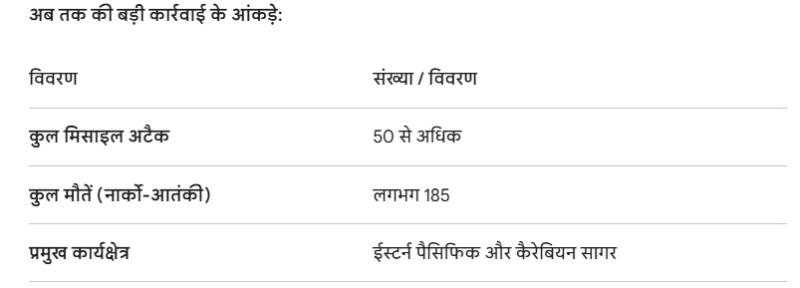 यह अभियान दर्शाता है कि अमेरिका अब ड्रग्स तस्करी को केवल अपराध नहीं बल्कि राष्ट्रीय सुरक्षा के लिए एक बड़े खतरे (आतंकवाद) के रूप में देख रहा है। सैन्य कमांड के अनुसार, आने वाले दिनों में कैरेबियन सागर और प्रशांत महासागरीय क्षेत्रों में गश्त और हवाई हमलों को और भी तेज किया जाएगा ताकि अमेरिका की सीमाओं के भीतर नशे की पहुंच को पूरी तरह रोका जा सके।